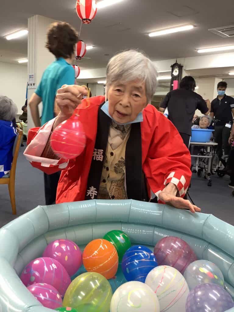 最後は「ヨーヨー釣り」。色とりどりのヨーヨーに挑戦するご利用者の皆さんの表情はとても真剣で、釣り上げた時には思わず笑みがこぼれていました。