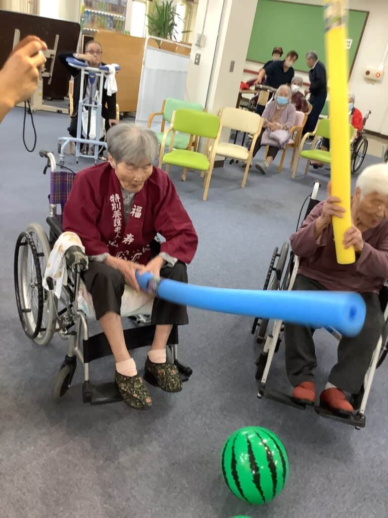 続いては「スイカ割り」。本物のスイカ……ではなく、すいか柄のビーチボールを使ったユニークなゲームに、皆さん大盛り上がり! 車いすの方も職員のサポートを受けながら、楽しく参加されていました。