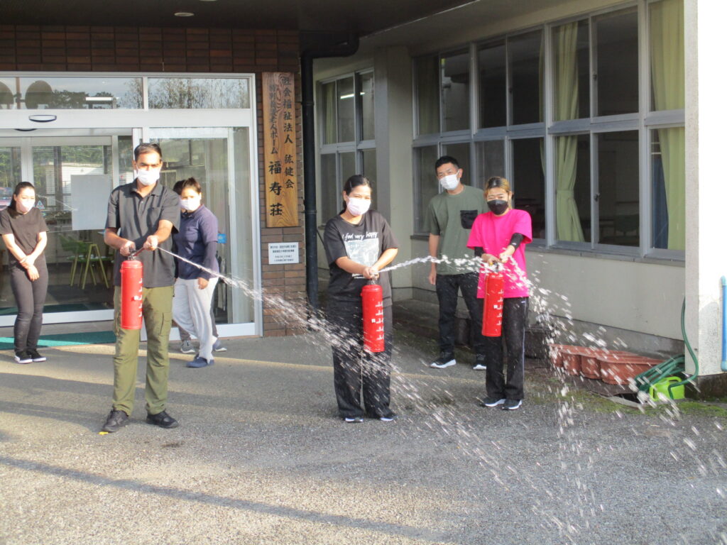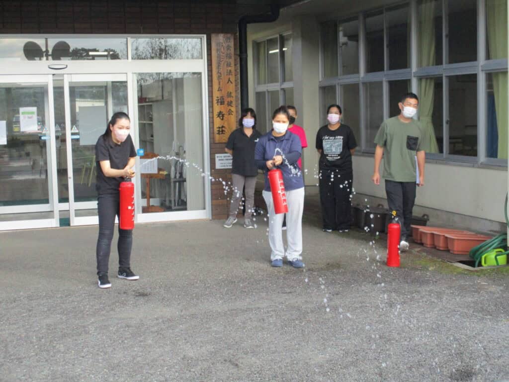 防火訓練を実施しました 2025.11.20 福寿荘では、万が一の火災に備え、防火訓練を実施いたしました。今回は避難誘導、初期消火、通報訓練などを通して、職員一人ひとりが防災意識を高める機会となりました。ご利用者様の安全を第一に考え、今後も定期的な訓練を継続してまいります。